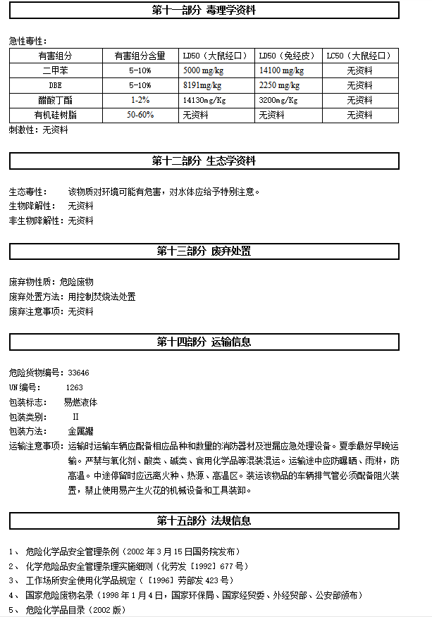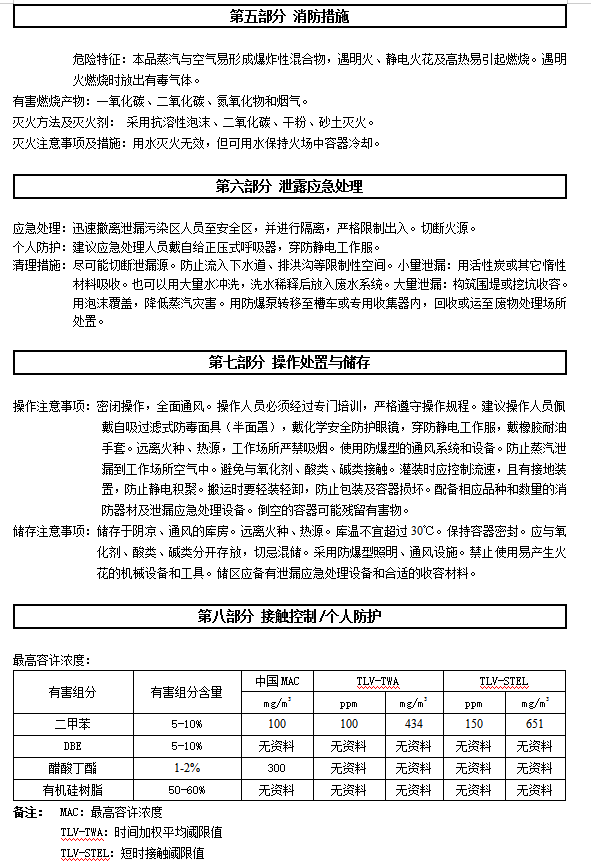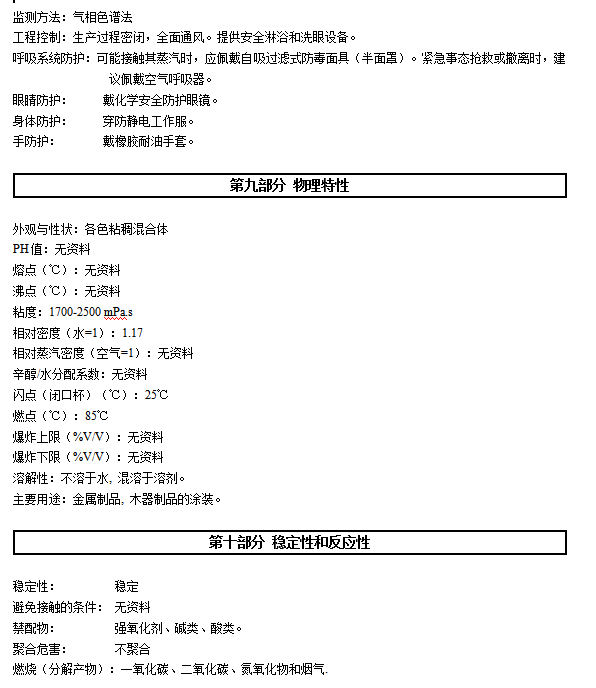 會引起眼睛和皮膚的刺激。反應(yīng)的蒸汽可能會引起過敏人群的呼吸道刺激??赡軙鹌つw過敏反應(yīng)。避免呼吸蒸汽。請勿觸及眼睛、皮膚。要使用眼、耳、皮膚的防護(hù)用具,使用合適的面具,以避免潛在的呼吸道刺激。使用后用清水徹底的清洗皮膚。如有不適請咨詢醫(yī)生。衣物再次使用前要洗滌。如果沒有呼吸要進(jìn)行人工呼吸,最好嘴對嘴,并請醫(yī)生處理。灼傷:放熱反應(yīng)會使產(chǎn)品變熱,超出正常水平。在混合后要小心處理。使用手套。急救:如果不慎接觸了眼睛,立即用清水沖洗至少 15 分鐘,并脫去污染的衣鞋,用肥皂清洗接觸后的皮膚。