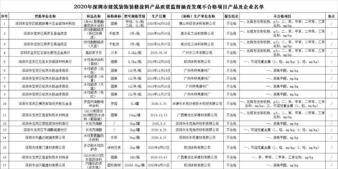 3月10日,深圳市市場監(jiān)督管理局發(fā)布《關(guān)于2020年建筑裝飾裝修用涂料產(chǎn)品質(zhì)量監(jiān)督抽查結(jié)果通報》。通報指出,深圳市市場監(jiān)督管理局組織開展了建筑裝飾裝修用涂料產(chǎn)品質(zhì)量監(jiān)督抽查, 檢驗發(fā)現(xiàn)不合格樣品17批次,不合格產(chǎn)品發(fā)現(xiàn)率為8.1%。